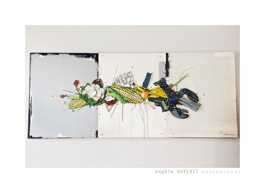 ERIC LIOT né à Caen en 1964. Il est à la fois peintre, sculpteur, assembleur et collagiste qui s’amuse à jouer les récupérateurs d’images afin de nous transporter dans son univers. Il travaille dans l’instant, se nourrissant d’images et de personnages du quotidien pour fixer nos icônes contemporaines. Le bois demeure son matériau de prédilection qu’il utilise pour créer une sorte de collection imaginaire où les symboles se hissent au rang de logos.